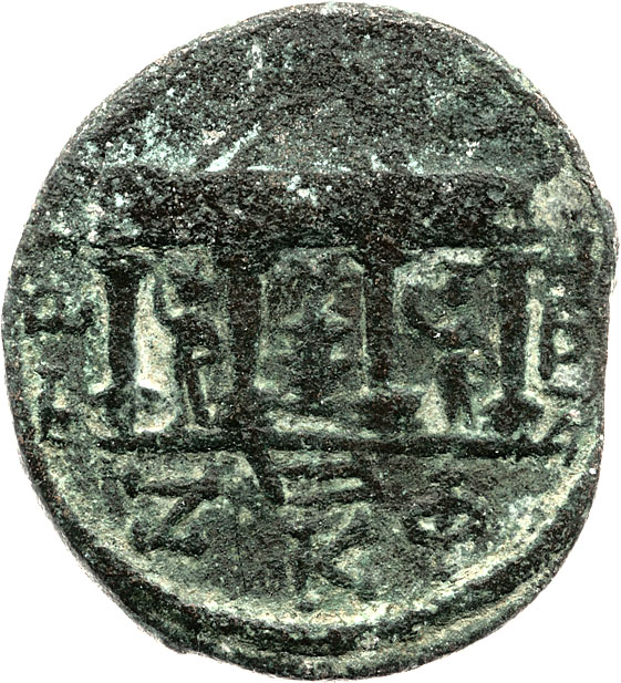 temple with four columns of Zeus Hagios, within lighted altar between figures of Sol, to left, and Luna, to right, standing facing; sometimes pellet in pediment; date in exergue