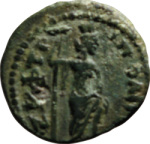 Astarte wearing turreted crown, standing right, left foot on prow, right hand resting on standard, left raising chiton to knee