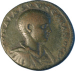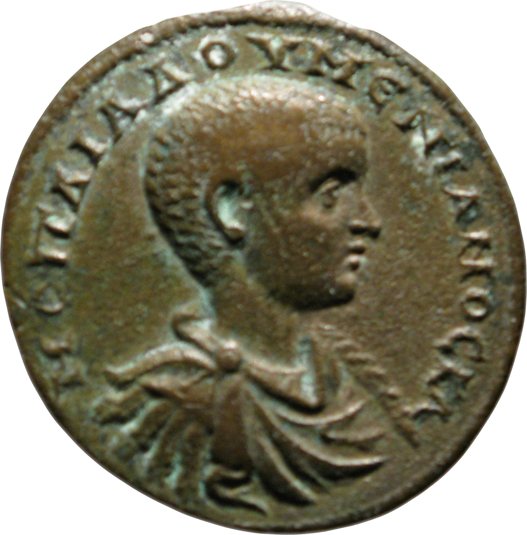 temple of Astarte, consisting of central portion surmounted by arch and two wings with four columns with pediments; flat roof over the wings and pediment over central portion; steps approaching middle of podium; within, Astarte wearing turreted crown, standing facing, right hand resting on standard, raising chiton with left, left foot on prow; she is crowned by small Nike on column on right; date in exergue |