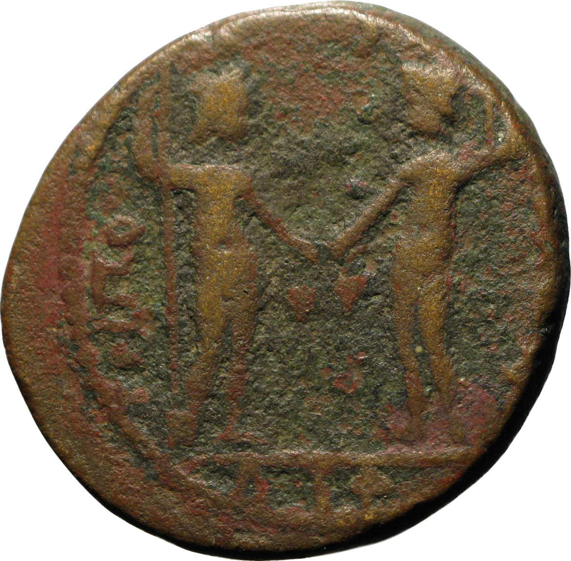 the Dioscuri, nude, facing each other, each resting on spear and holding bunch of grapes; date in exergue