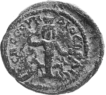 Hadad (Zeus of Heliopolis), standing facing, wearing bull horns and kalathos, holding whip in right hand and corn ear in left, flanked by two bulls