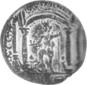 temple with four columns shown in perspective, with central arch; within, Tyche standing left, right foot on small reclining figure, holding sceptre in left hand and small bust in right extended hand; behind her, small standing figure; date in exergue |