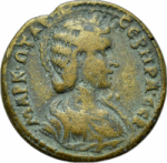 Apollo of Hierapolis standing right, holding plectrum and lyre, facing cult statue of Artemis Ephesia standing facing |