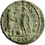 Kabeiros and Apollo standing facing each other; Kabeiros holds hammer on his left shoulder, Apollo a laurel branch in his left, both holding five apples in their right hand; between them, elephant tusk on altar and agonistic crown with palm branch |