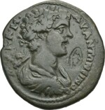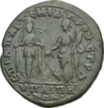 Artemis Anaïtis standing facing, veiled and draped, and Tyche standing left, holding rudder and cornucopia |
