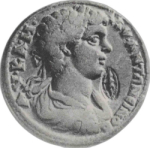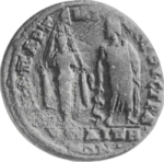 Artemis Anaïtis standing facing, veiled and draped to feet; on right, Asclepius facing, looking left, holding serpent-staff |