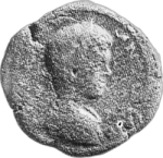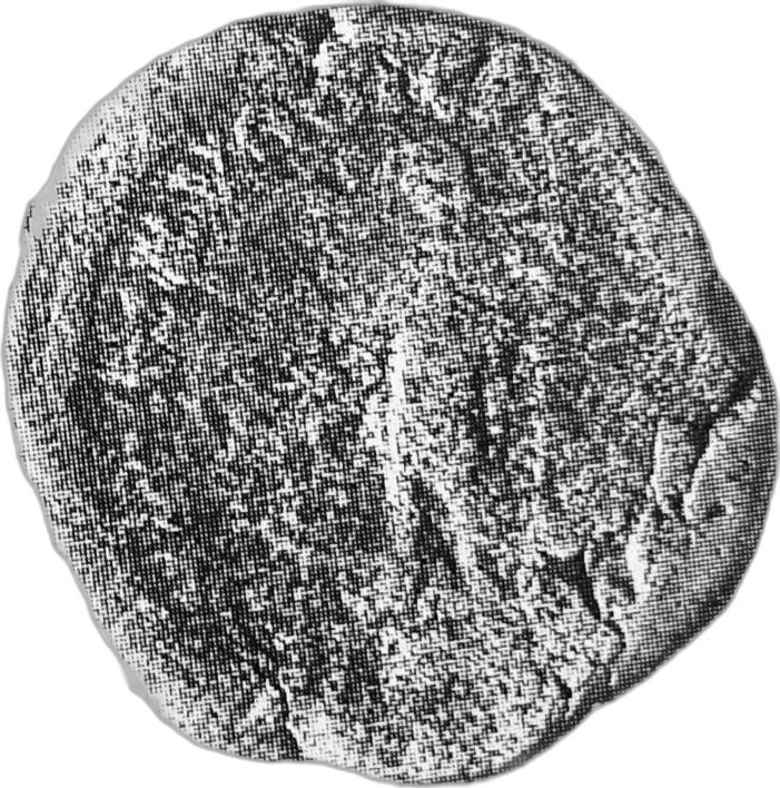 Dionysus(?) standing facing wearing short chiton with chlamys over his left shoulder, holding thyrsus(?) in his left hand and cantharus in his outstretched right; date in exergue |