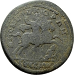 Septimius Severus in military dress with cloak floating behind him, on horse prancing right, brandishing in right hand spear at enemy advancing right, head left