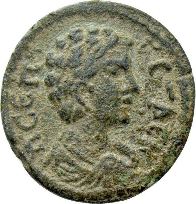 bare-headed, draped and cuirassed bust of Geta, right, seen from rear