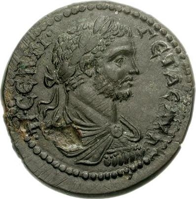 laureate, draped and cuirassed bust of Geta, right, seen from rear