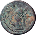 Tyche standing facing, head left, holding rudder in her right hand, cornucopia in left