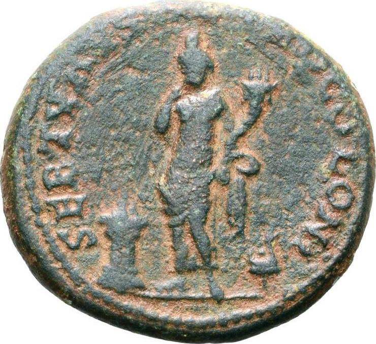 Harpocrates standing facing, raising right hand to lips and holding cornucopia in left; lighted altar to left, murex shell to right