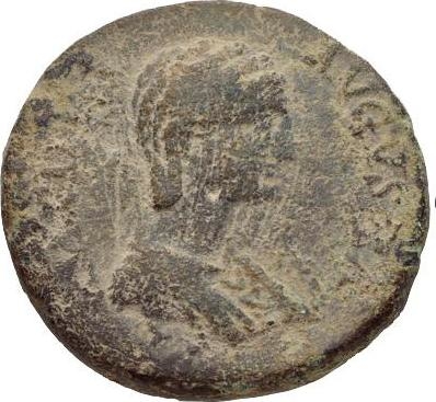 Astarte, wearing turreted crown, standing facing, head left, left foot on prow, right hand adorning trophy and holding sceptre in left, being crowned by Nike standing left on column at right