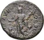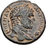 Hercules standing left, sacrificing with patera over lighted altar to left and holding club and lion skin; to inner left, two baetyls (Ambrosial Rocks); murex shell to right