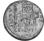 priest ploughing right with a team of yoked oxen; in background, vexillum inscribed |