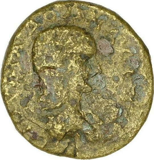 temple with four columns with central arch; within, Tyche facing, right foot on rock(?), head left, left hand resting on sceptre and small bust on extended right hand; small figures standing between outer columns |