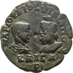confronted busts of Philip II, bare-headed, draped and cuirassed, right, seen from rear, and Sarapis, draped, left