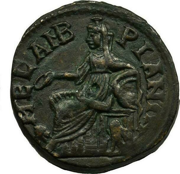 Cybele seated left, holding patera and resting arm on tympanum; at feet, lion on either side of her