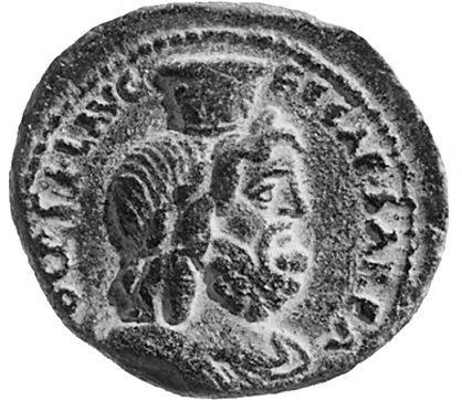 laureate, draped and cuirassed bust of young Caracalla, right, seen from rear |