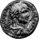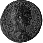 laureate, draped and cuirassed bust of Caracalla, right, seen from rear; in right field, spear pointing upwards