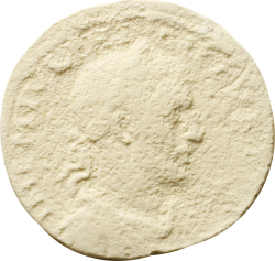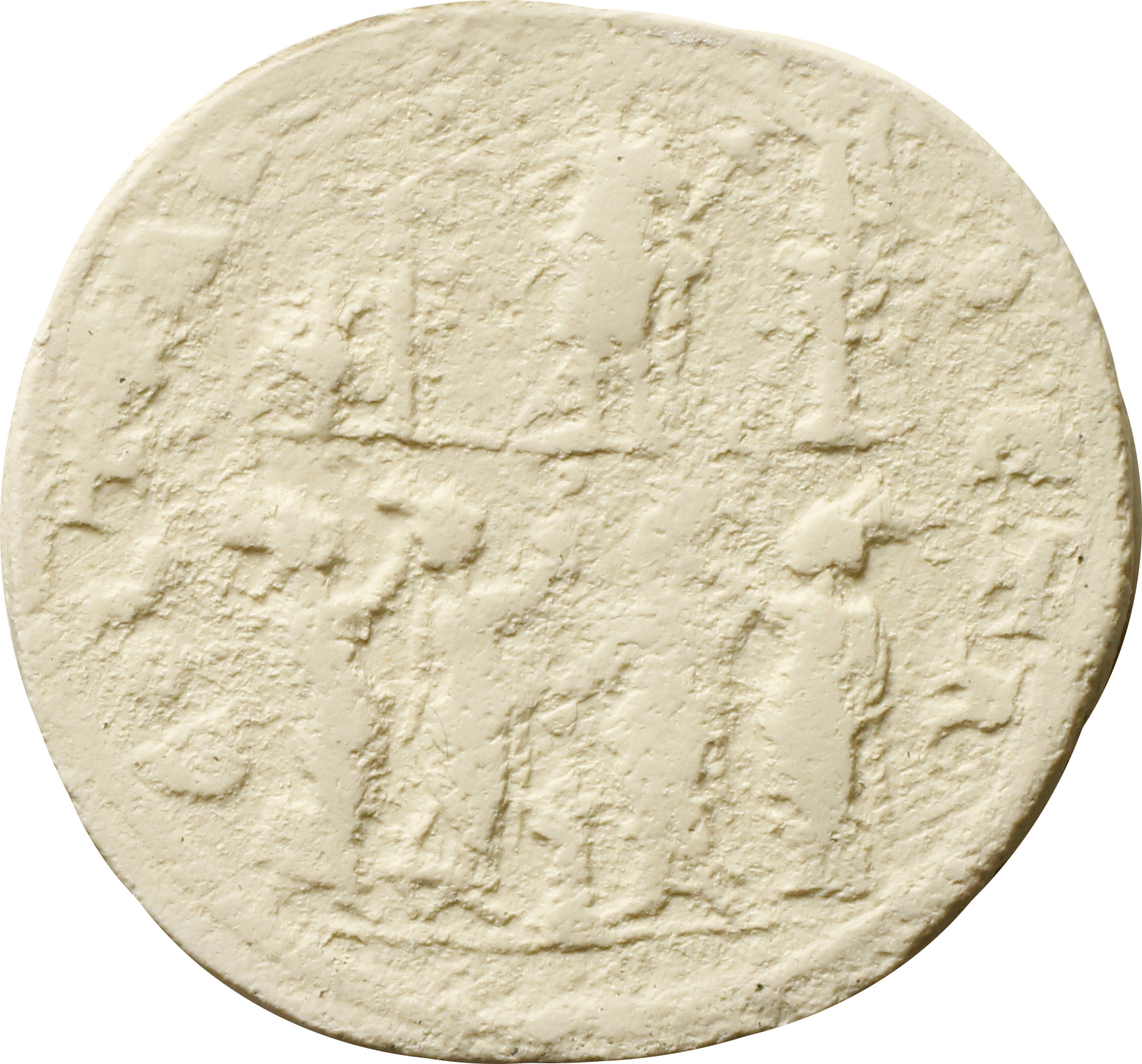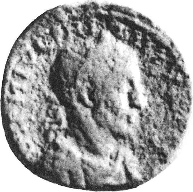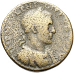 Astarte standing facing, placing right on palm tree to left and holding sceptre, crowned by Victory on column to right; on her side, murex shell; below, four Tychai standing, with altar in between, sacrificing to Astarte: the first is right, looking up with upraised right hand; the second is right, looking up and holding with upraised right hand dish with offerings; the third is left, looking down and pouring libation on altar; the fourth is left, holding with upraised right wreath |