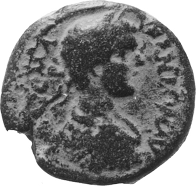 laureate and draped bust of young Caracalla, right, seen from rear