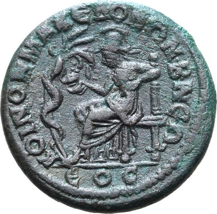 Athena seated left, feeding serpent (entwined around olive tree) from patera, resting on throne |