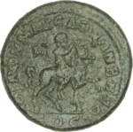 Alexander the Great riding Bucephalus advancing right, raising hand |