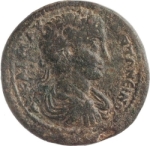 Kore of Sardis standing,facing, wearing tall crown and Zeus Lydios standing right, holding eagle and sceptre |