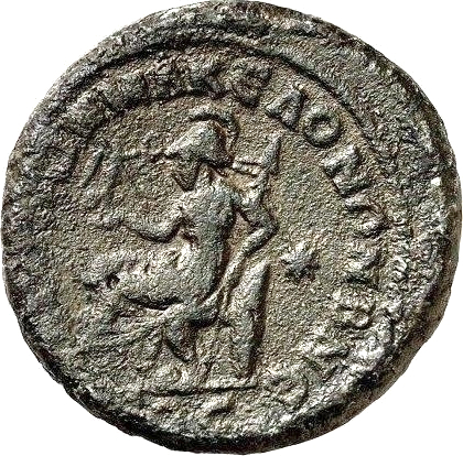Athena seated left, holding Nike and spear; beside throne, shield; star in right field |