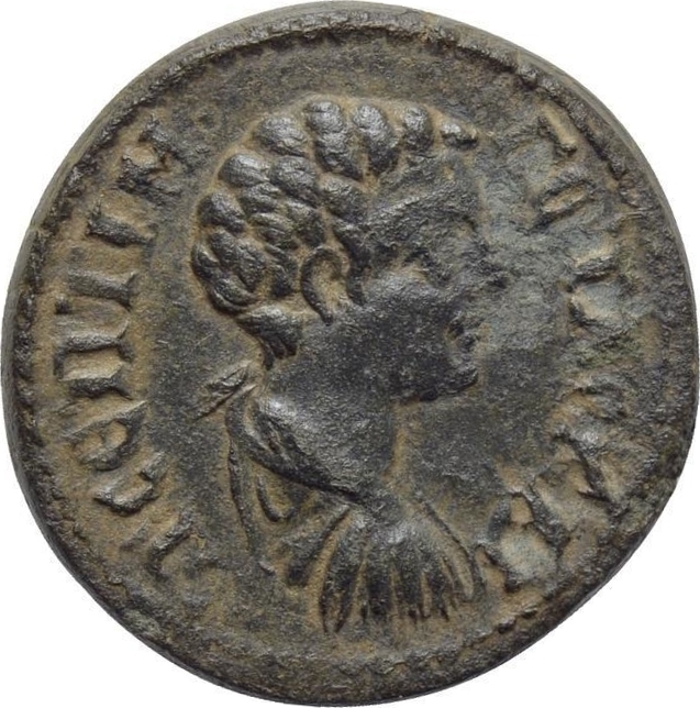 bare-headed, draped and cuirassed bust of Geta, right, seen from rear