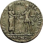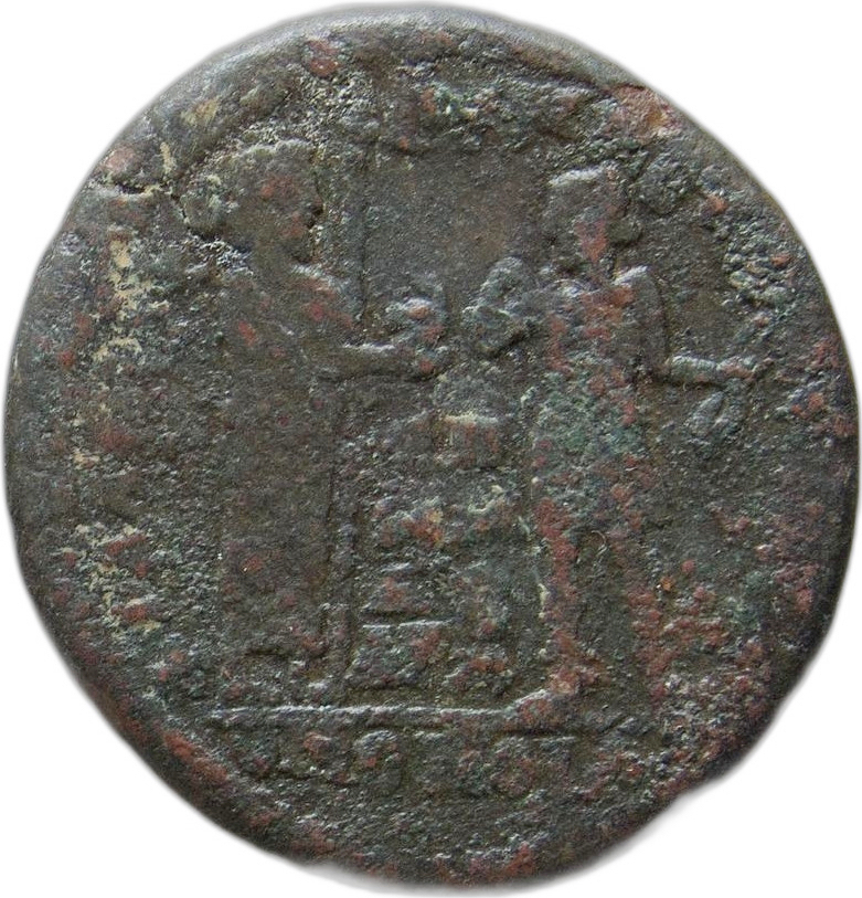 Zeus standing right, holding eagle and sceptre, facing Artemis standing left, holding bow, with quiver at feet |