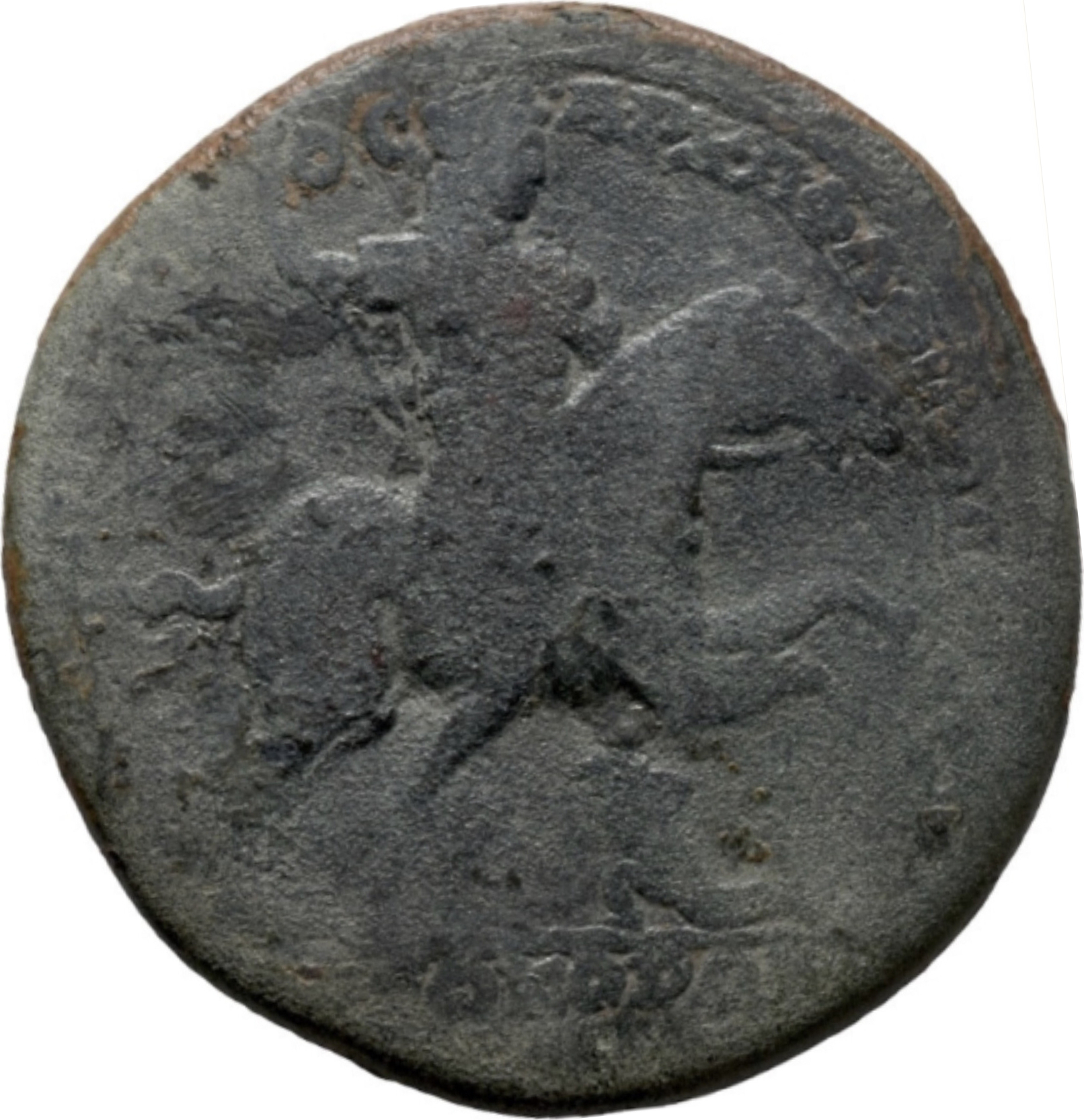 Caracalla galloping right, brandishing spear at bound and seated captive |