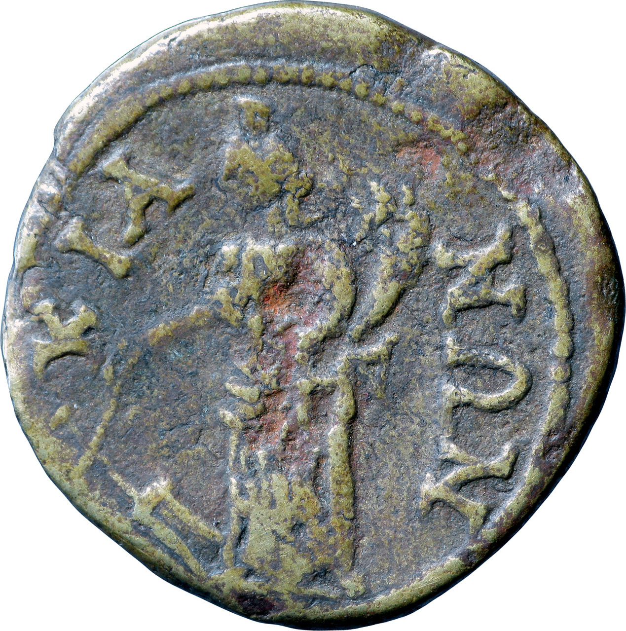 Tyche standing left holding rudder and cornucopia