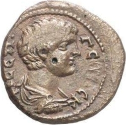 bare-headed, draped and cuirassed bust of Geta, right, seen from rear
