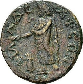 Zeus Lydios standing facing, looking left, holding long sceptre and patera over an altar