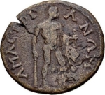 Heracles standing right, resting with his right hand on club, holding lion skin and bow with his left