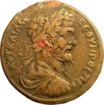 Mên standing right, crescent at shoulder, holding pine cone and sceptre facing Cybele seated left, holding patera and resting on tympanum, at her feet, lion seated |