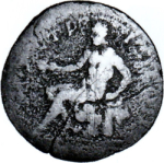 Heracles seated left on rock covered by lion skin, holding cantharus in his right hand, his left resting on club