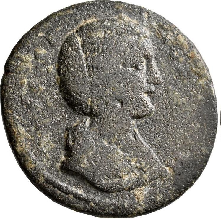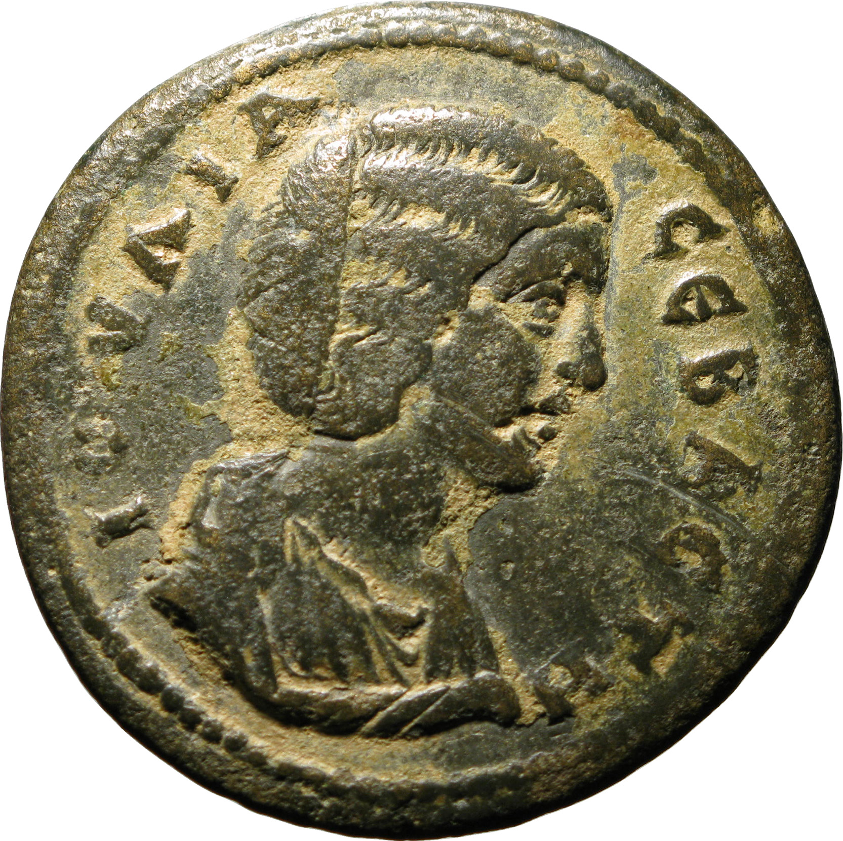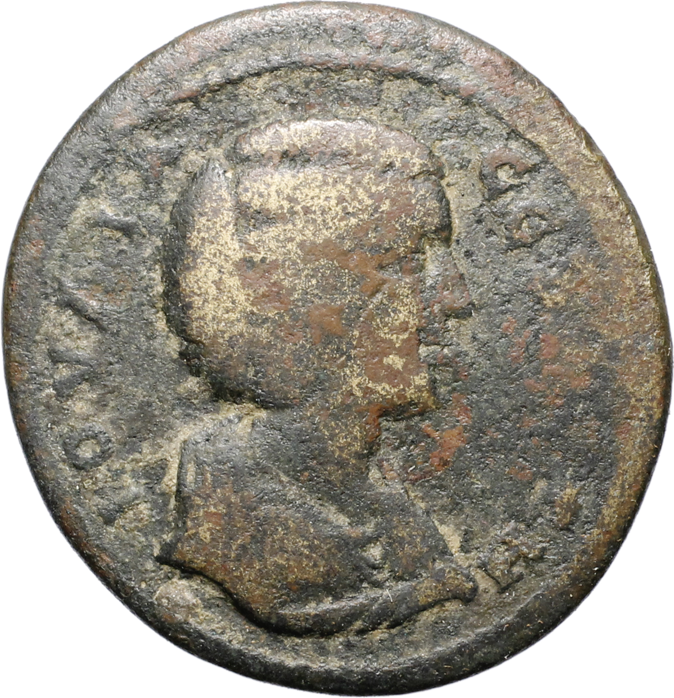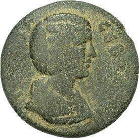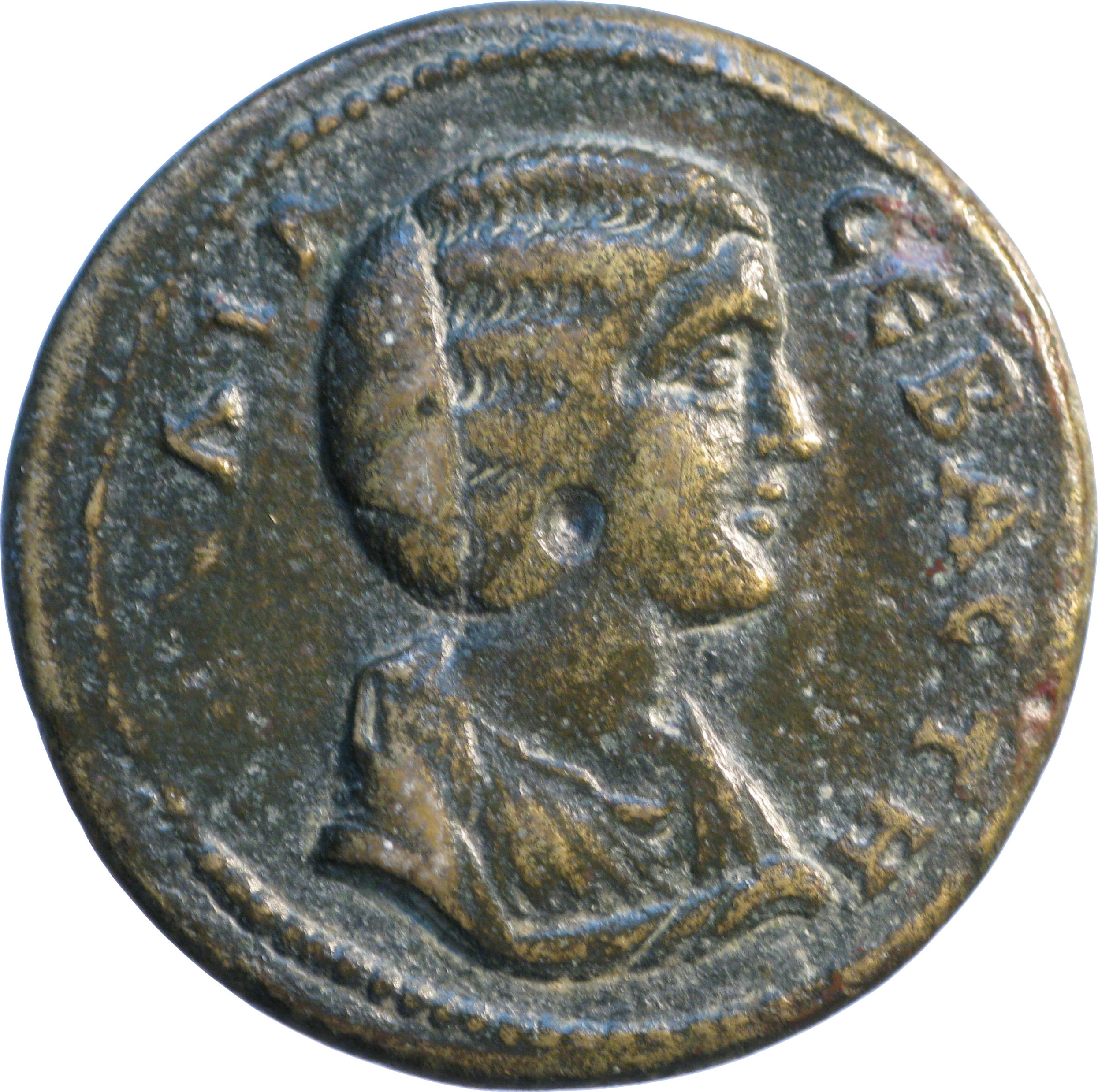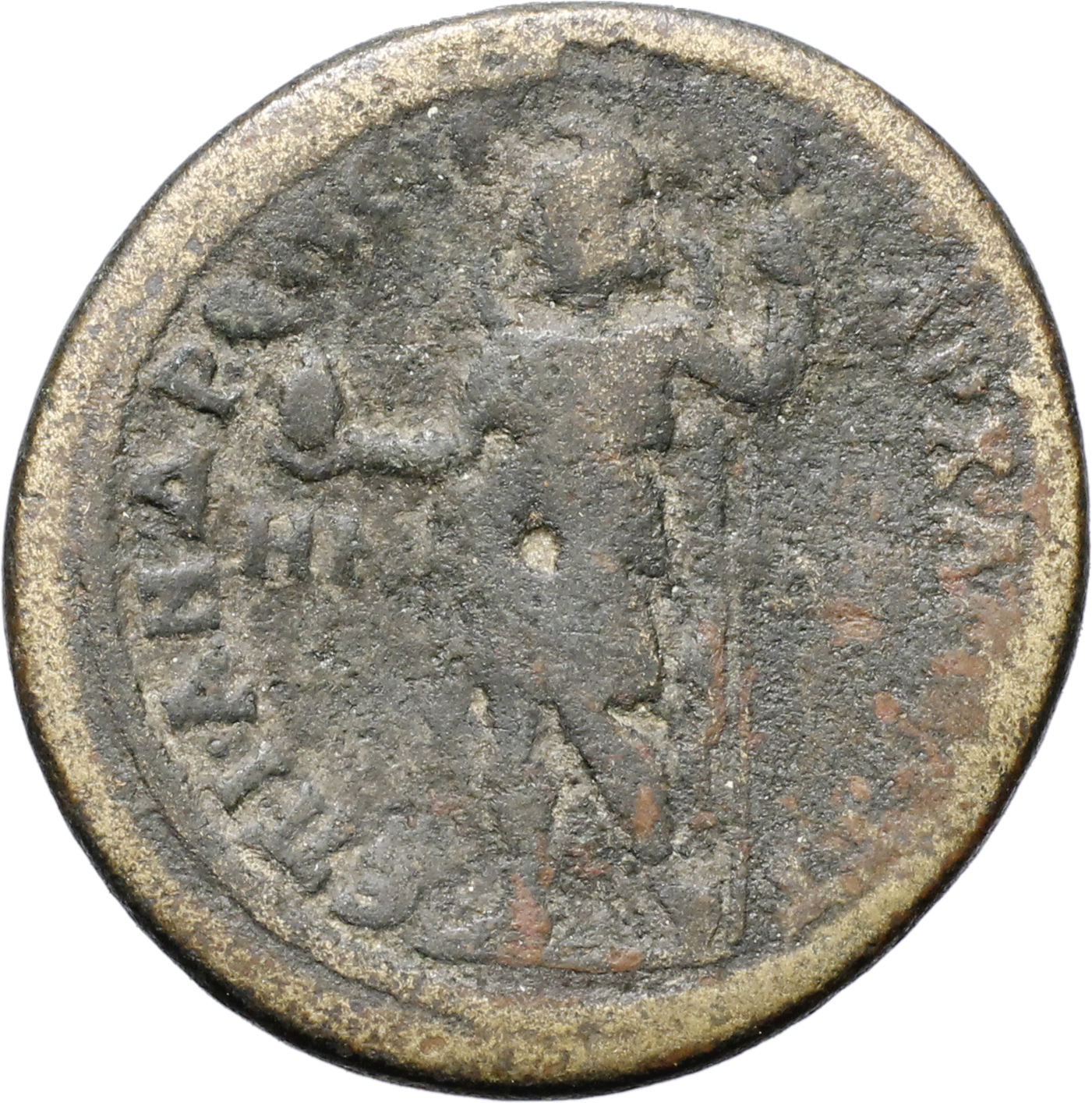 Mên standing, left, crescent at shoulders, holding pine cone and sceptre |