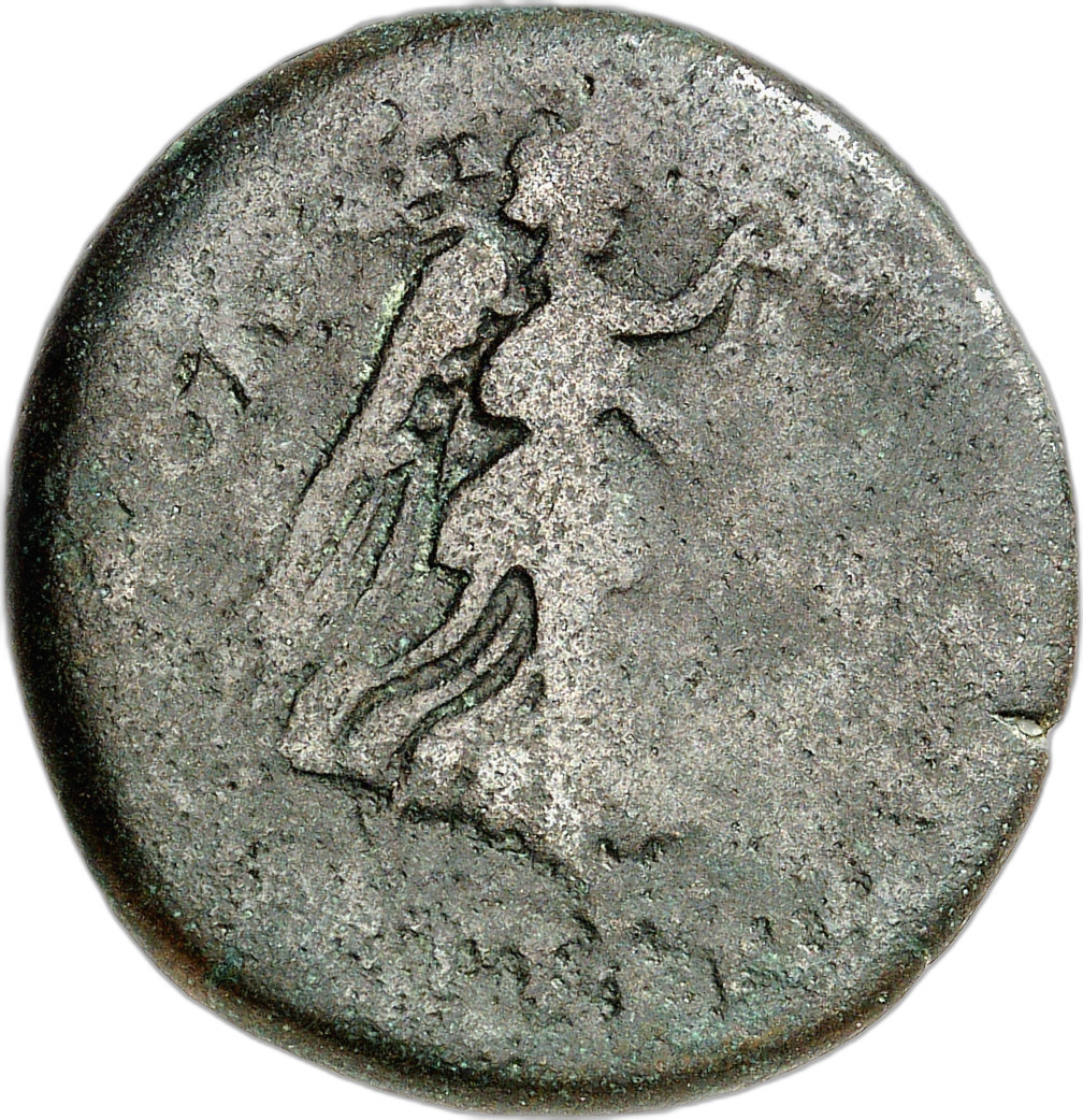 Nike advancing right, with palm and wreath