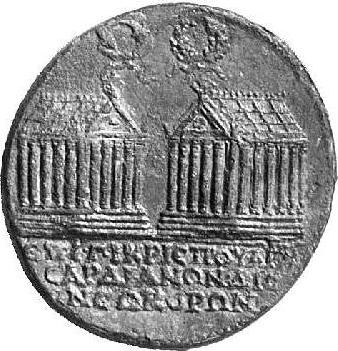 two temples with six columns facing each other, seen from a three-quarter view; above each, wreath |