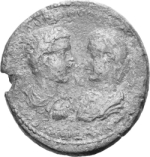 laureate, draped and cuirassed bust of Caracalla, right, seen from rear, facing draped bust of Plautilla, left