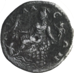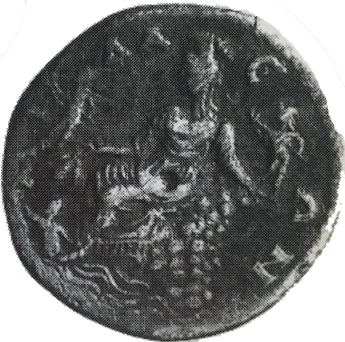 Tyche of Midaeum seated left on rocks, holding corn ears in her right hand and leaning left on rocks; above both her hands, two Erotes holding torches; at her feet, river god Tembrus swimming left