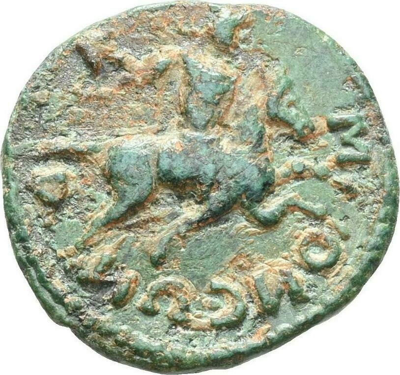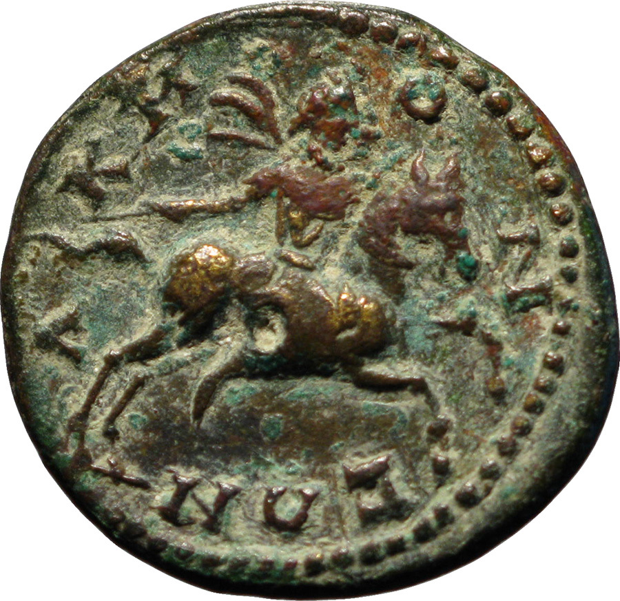 hero Akmôn with flying chlamys, holding whip, galloping on horse right