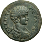Hermes standing facing, naked but chlamys hanging from his shoulders, head left, holding purse and caduceus |