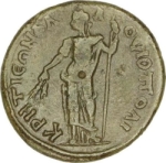 Demeter standing facing, head left, holding downwards ears of corn and resting on sceptre