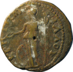 Athena standing facing, head left, holding patera in her right hand, her left resting on sceptre; at her feet, shield