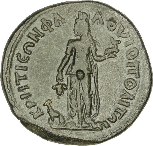 turreted Tyche (?) standing facing, head left, holding grapes and stag (?); at her feet, left, dog (?)