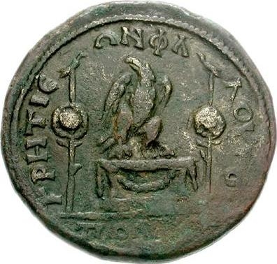 eagle standing facing on garlanded altar, looking left, between two aquilae; capricorn on top of each aquila